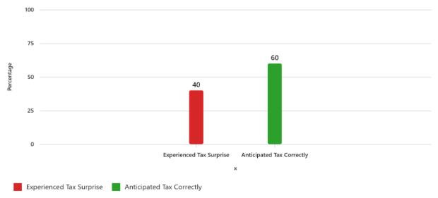 Graph showing: Nearly 40% of equity holders were surprised by their tax bill after vesting or exercising (American Institute of CPAs). Suggested visualization: Bar chart showing “Experienced Tax Surprise” (40%) vs “Anticipated Tax Correctly” (60%) to highlight the coordination gap that creates unnecessary stress.