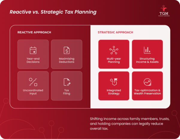 The real opportunities? Wealthy individuals don’t see taxes as just a compliance task but as a year-round strategy. They think of it as a system. They embed tax planning strategies into estate structures, business decisions, and investments, reducing their tax burden by 15–30%.